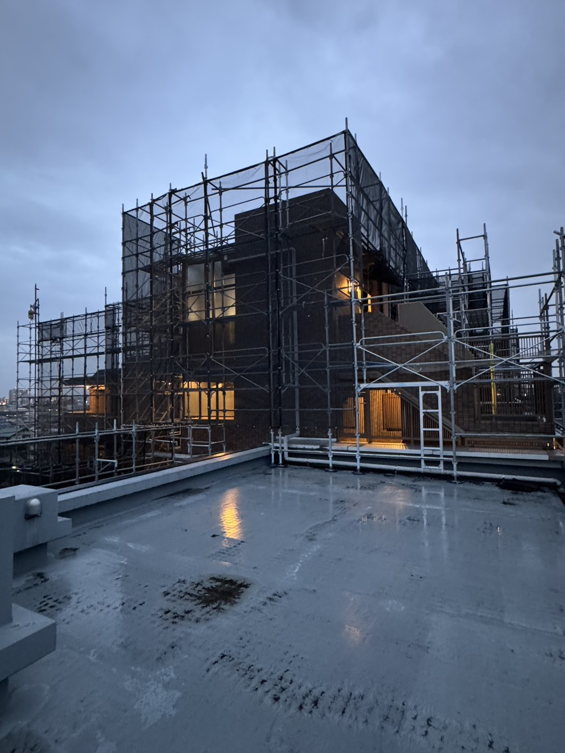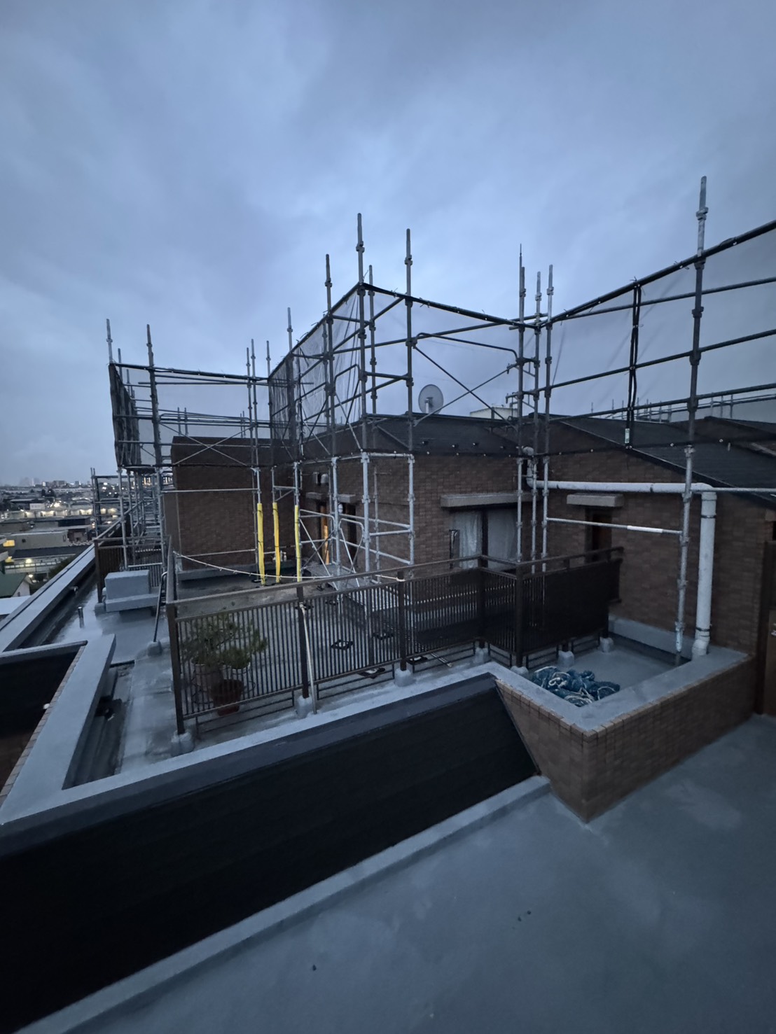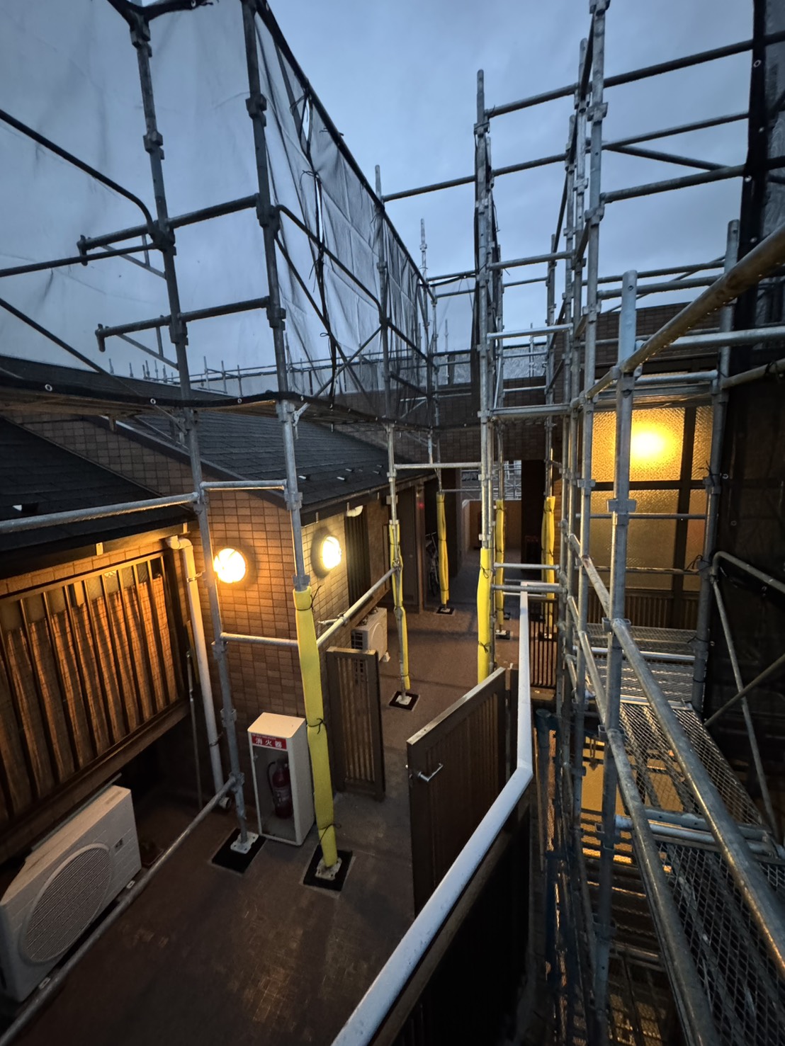 埼玉県さいたま市にて、マンション大規模修繕足場工事、組立進捗状況です。