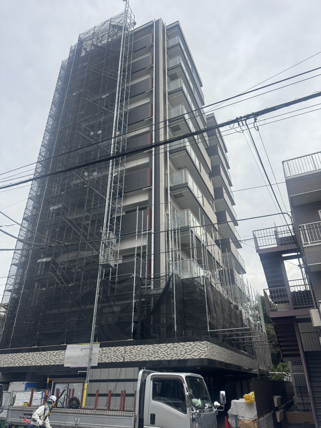 埼玉県さいたま市のマンション大規模修繕工事現場で、足場作業を解体作業を進行中です。