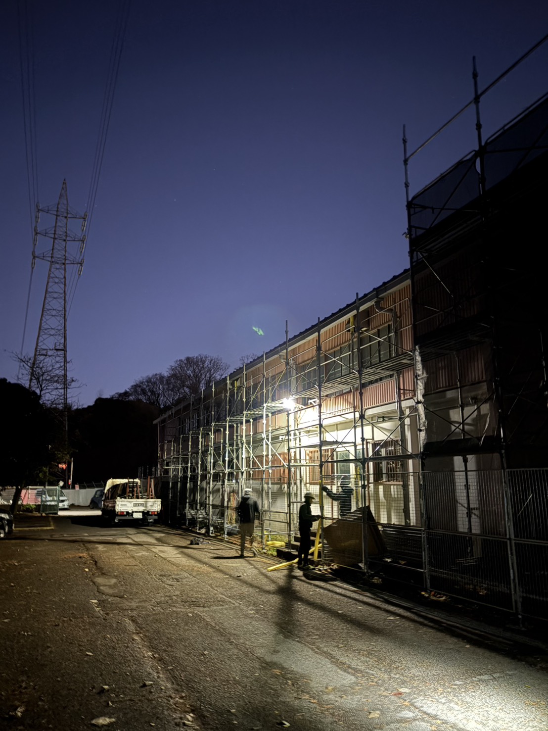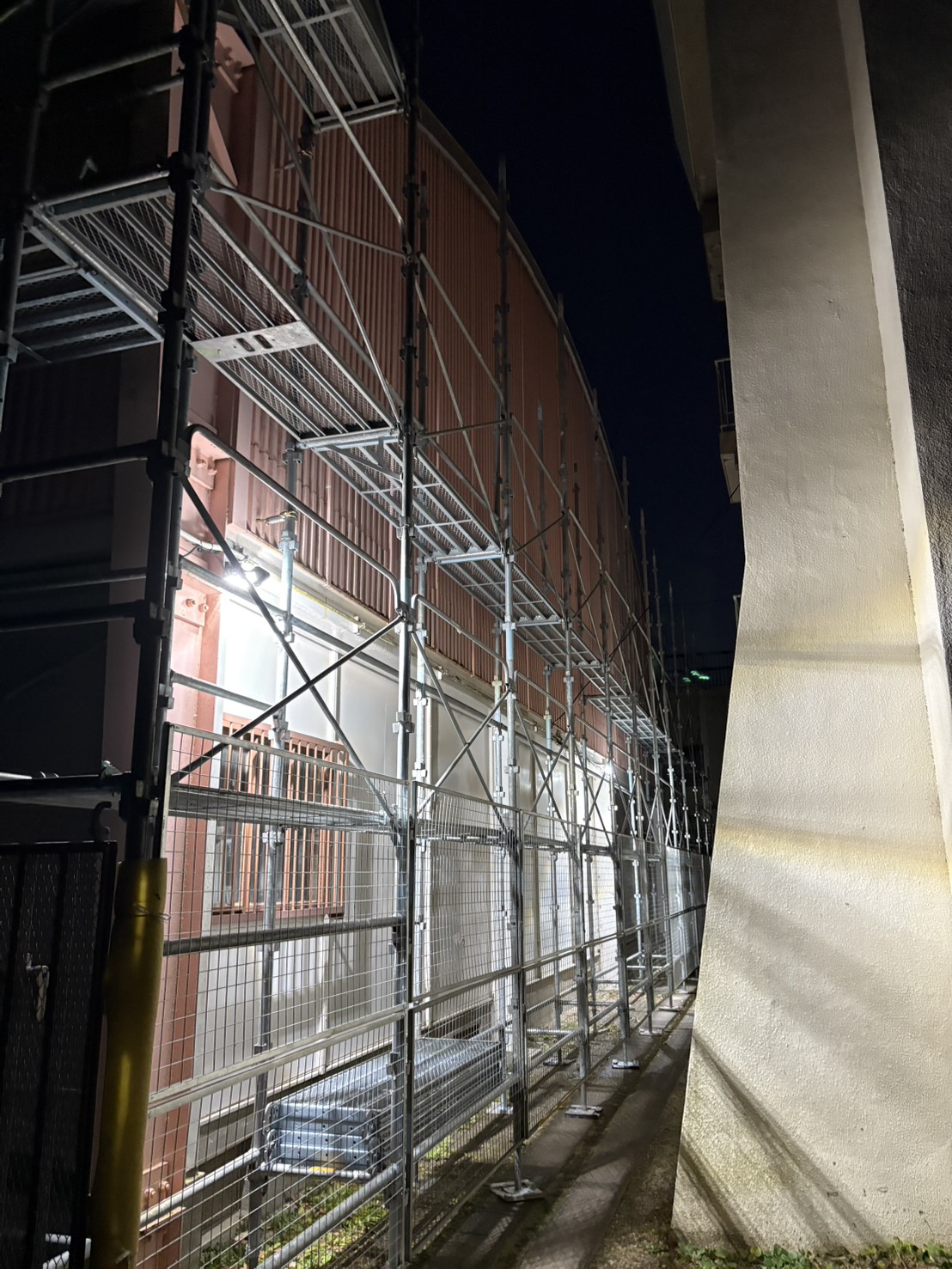 埼玉県川口市にて、公共施設大規模修繕足場工事、組立着工いたしました。