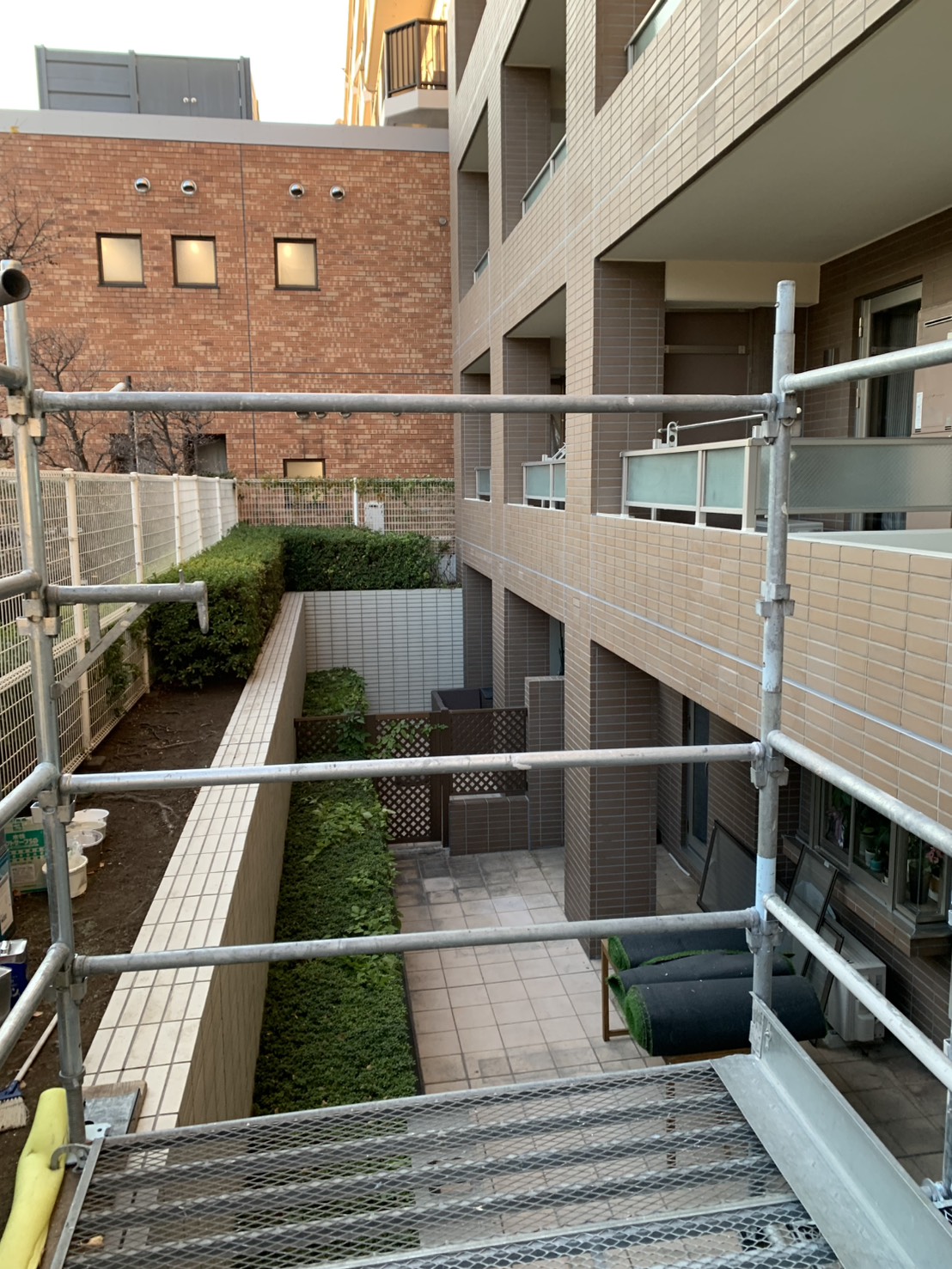 東京都世田谷区にて、マンション大規模修繕足場工事、解体進捗状況です。