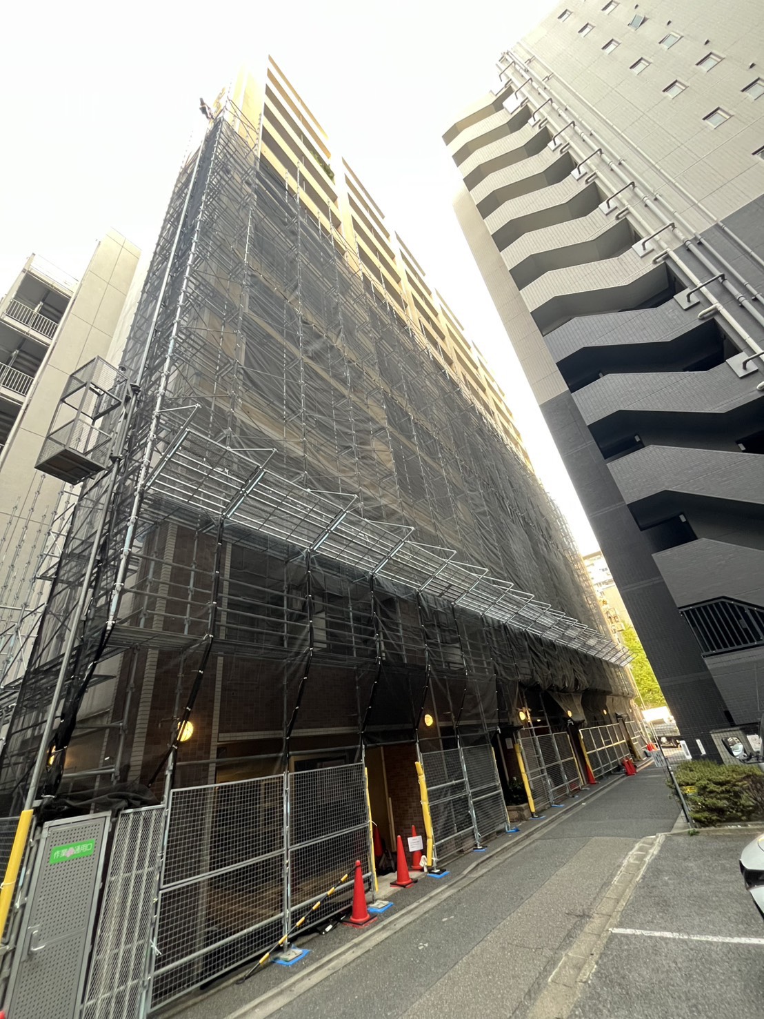 東京都中央区にて、マンション大規模修繕足場工事、組立進捗状況です。
