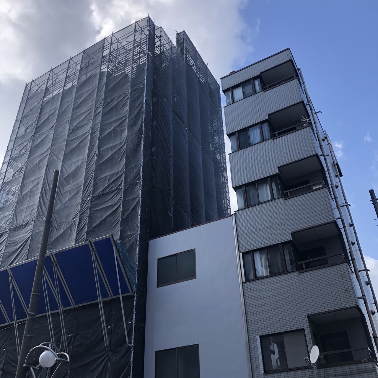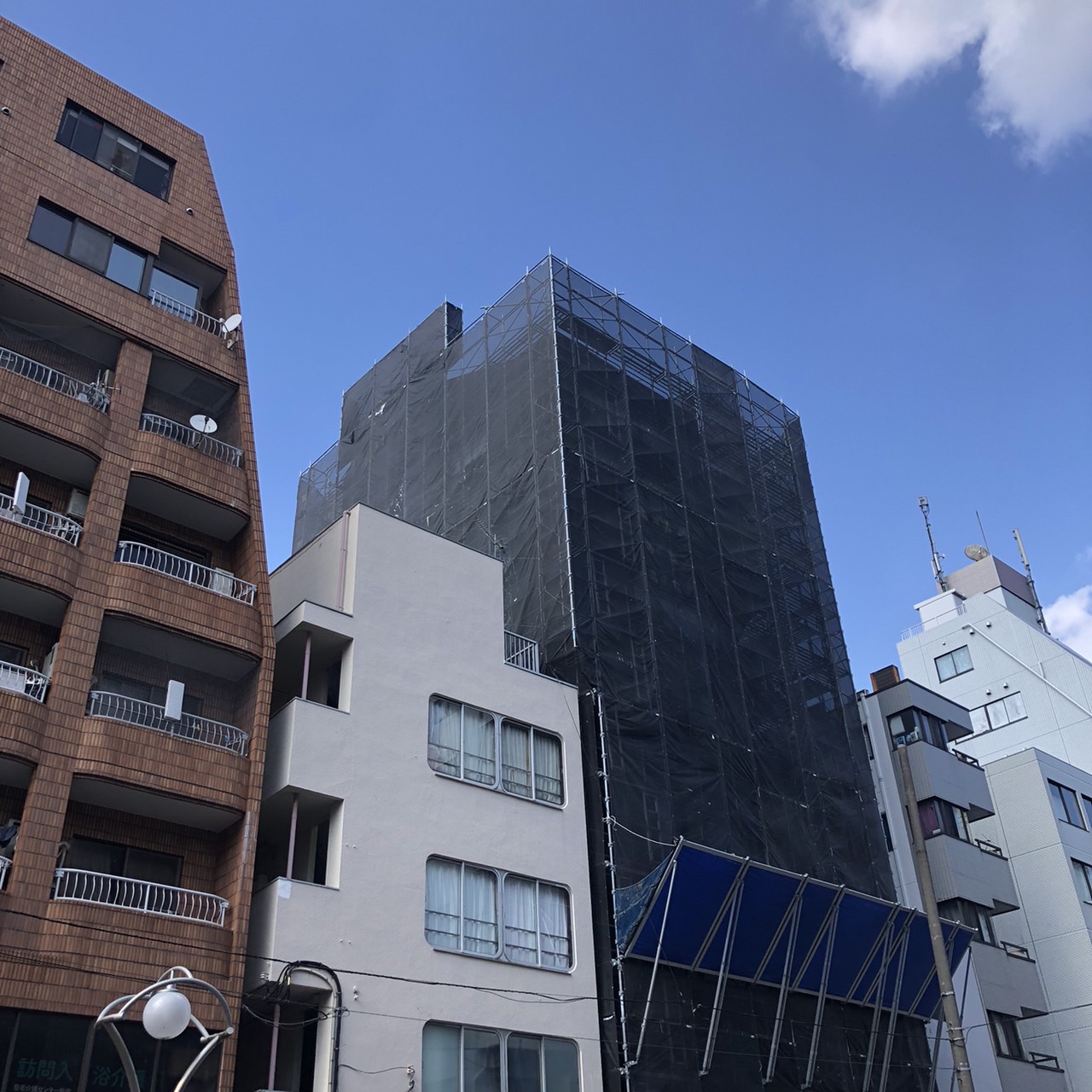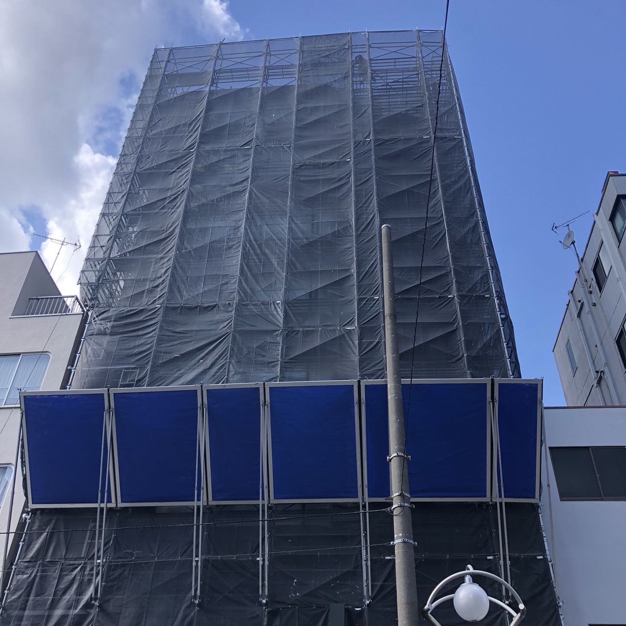 東京都新宿区にて、ビル大規模修繕足場工事、組立完工いたしました。